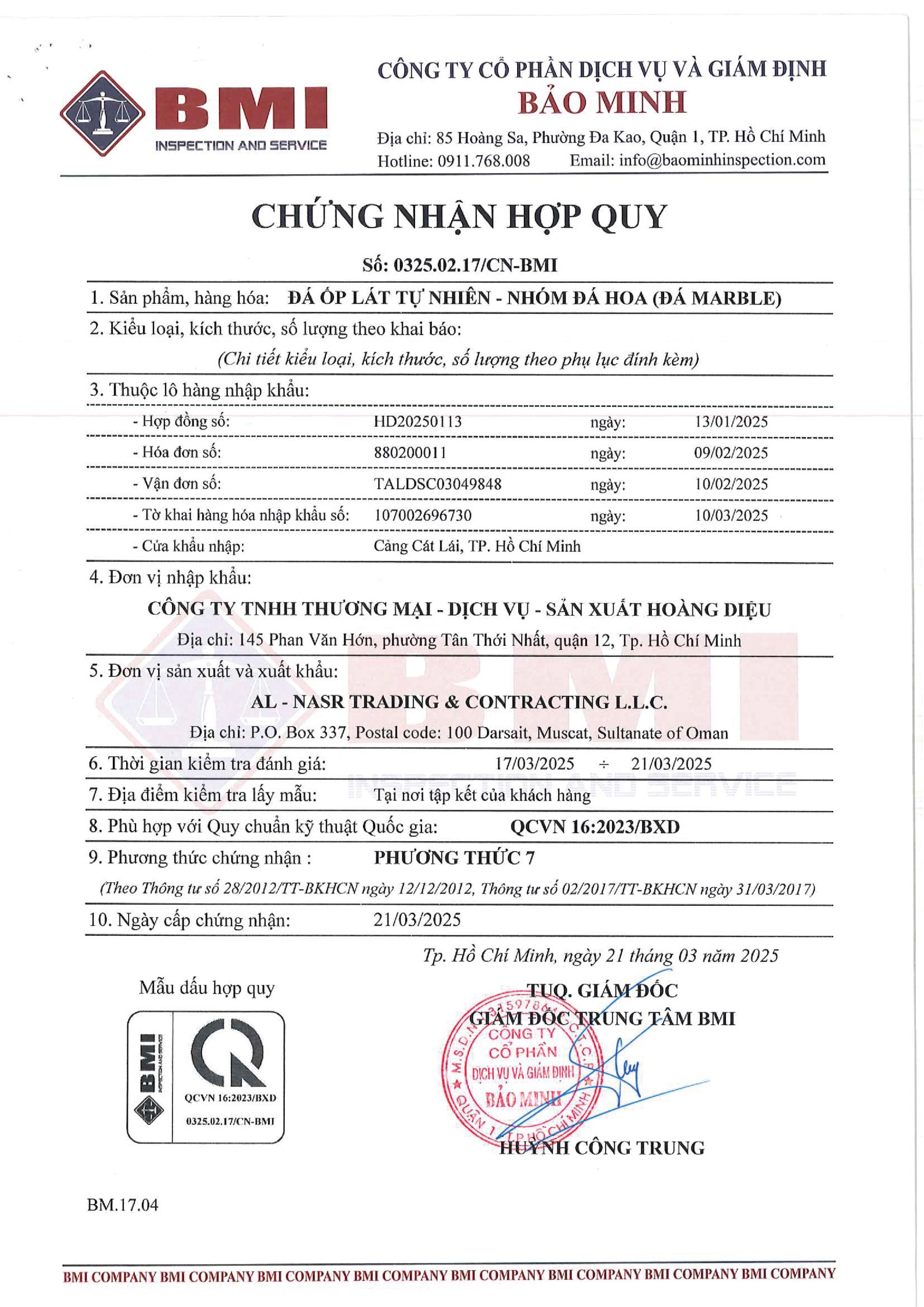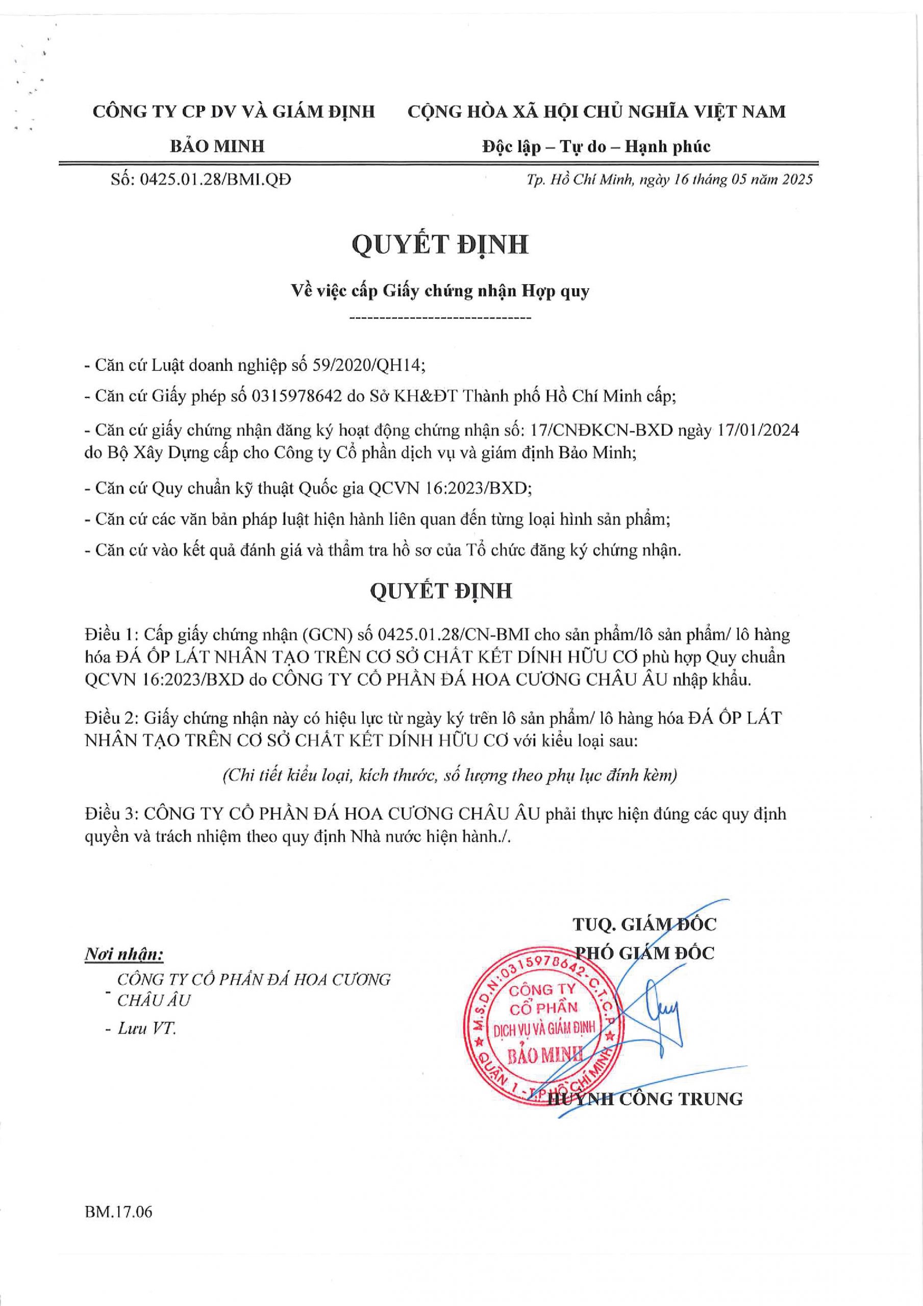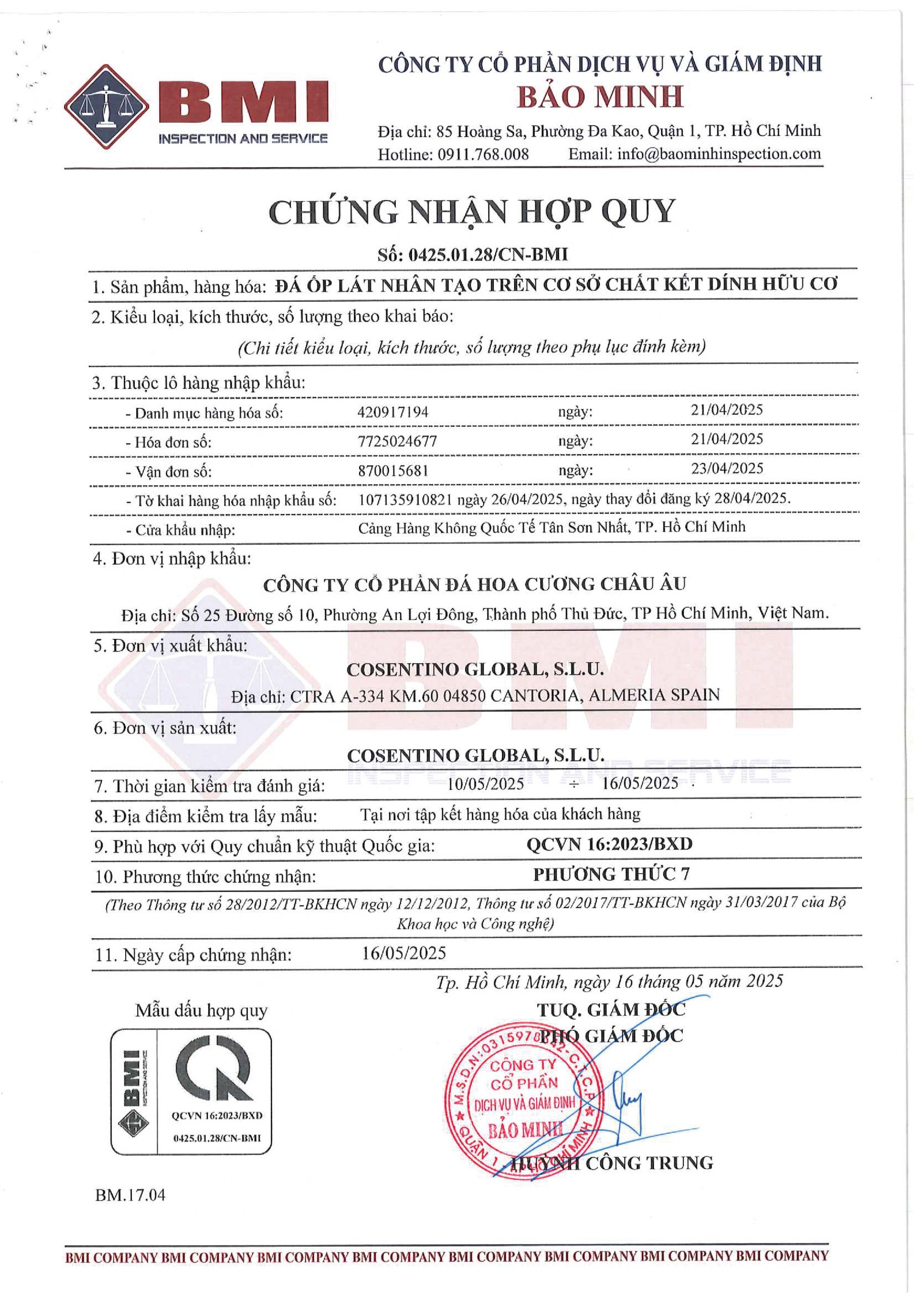 BMI COMPANY sẽ thông báo kết quả thử nghiệm mẫu điển hình và kết quả đánh giá điều kiện đảm bảo chất lượng cho khách hàng. Nếu kết quả trên phù hợp với các yêu cầu quy định thì khách hàng sẽ được BMI COMPANY cấp giấy chứng nhận Hợp quy vật liệu xây dựng theo QCVN 16:2023/BXD.